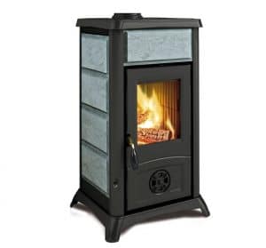 Erhältlich in den Kachelfarben bordeaux, cappuchino oder in grauem Naturstein. Die gusseiserne Brennkammer ist mit einem Drehrost ausgestattet und fasst Holzscheite bis 28 cm. Unter dem Brennraum befindet sich eine herausnehmbare Ascheschublade. Primär und Sekundärluftzufuhr (Scheibenspülung) sind getrennt regelbar und sorgen für eine saubere Verbrennung.